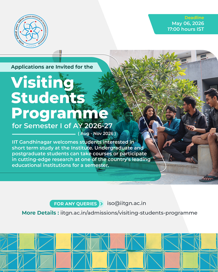 IIT Gandhinagar invites applications for visiting students in its undergraduate and postgraduate programmes. A student who is registered for a degree in a recognized institute or university in India or abroad, and who is officially sponsored by that institute or university to complete part of his/her academic requirements at IITGN, can apply for admission to IITGN as a visiting student. Such a student may carry out research, or take courses for credit or otherwise, or may use other academic facilities. However, any credits earned by a visiting student cannot be applied for any degree programme at IITGN at any time.